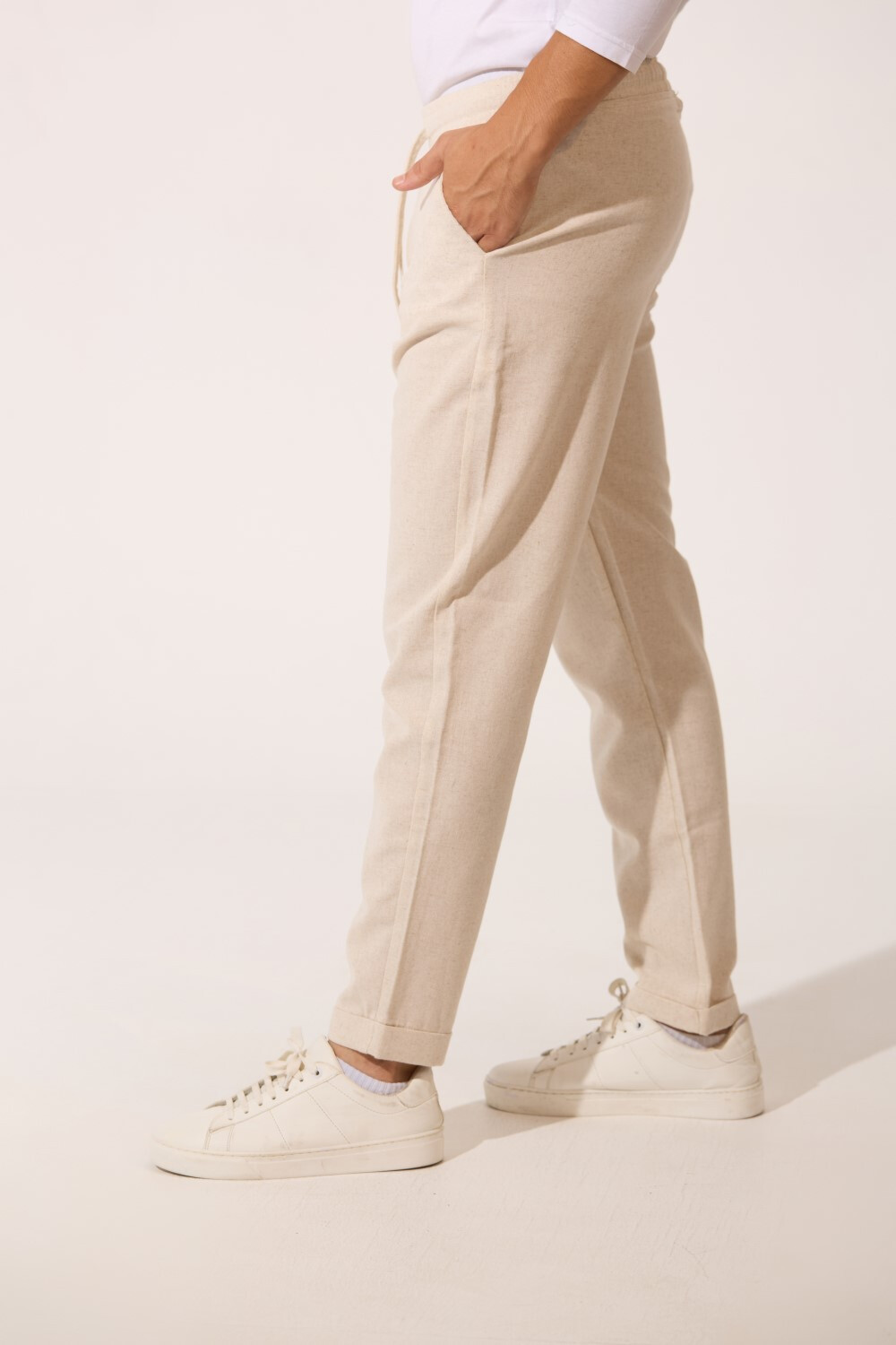 Men's Basic Slim Fit Linen Trouser Pants With Elastic Waist And Pockets